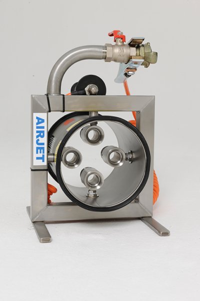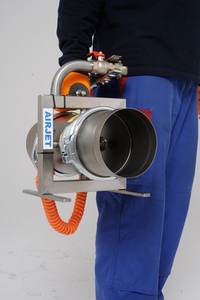 Der AIRJET hat ein sehr geringes Gewicht und ist daher als mobiler Ventilator bestens geeignet. Die Mehrfachanordnung der Druckluftdüsen (ECOJET) in einem Edelstahlgehäuse, welche über einen gemeinsamen Luftverteiler betrieben werden, bietet beste Voraussetzungen für den sekundären Entrainmenteffekt, der dem Prinzip der Raumfahrt-Trägerrakete entstammt. Das schnelle Anschließen an die werksseitige Druckluftversorgung und die einfache Handhabung ermöglichen kürzeste Reaktionszeiten zur raschen Beseitigung von Störfällen im Betrieb. Der AIRJET eignet sich für das Ent- und Belüften von Räumen, Kanälen, Tunnel, Tanks und Senkkästen etc. in denen Staub, Dämpfe oder gefährliche Gase über weite Strecken befördert werden müssen.